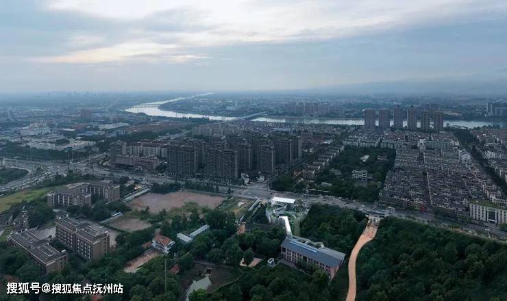 水景廊道与马路对面建筑屋檐同高度,因此,廊道上的人可以越过屋顶,以更开阔的视野远眺金华山水。