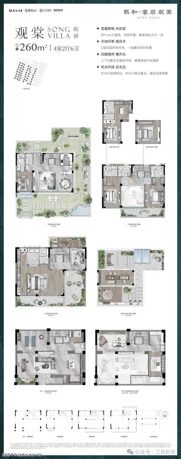 联排边户约260㎡,地上三层+地下一层,面宽约11.4米,地下室层高约5米,做到了5房6卫全明格局。花园、阳台、露台、挑空等空间可塑性强。