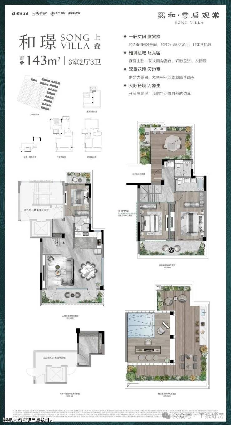 上叠约143㎡,为3房3卫配置,赠送客厅挑高、南北双露台及星空屋顶大露台,轻盈而通透。