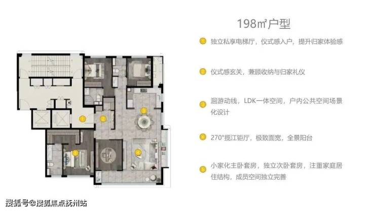 本项⽬楼王产品为198平⽶全景观江的端厅⼾型,通过南向阳台、东向飘窗的组合,使客餐厅区域获得了270°的全景观江视野。超大的玻璃窗分格设计,旨在使奉化江的美丽江景能尽收眼底。