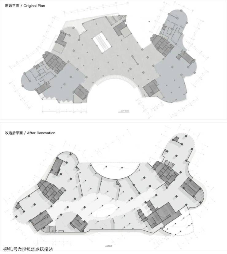 原建筑为纯办公属性,故原布局在南侧设置有内凹的集合广场,改造则引入了全新的使用需求——社区商业。新功能为总图布局提出了改造需求,商业需要开阔的沿街展示面和外摆空间,并面向主城市界面。而办公区则需要相对私密的空间流线和便捷的车库出入,同时业主还希望为其打造一个独立私密花园以区别于周边的普通写字楼。在和甲方/施工图院/结构工程师多次交流后,设计采用“腾龙换鸟”的策略,沿塔楼主体找结构梁,拆除北侧突出裙楼,将折损的面积全部补回南侧,填平内凹广场。