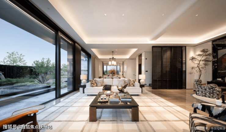 约3.9米的客厅层高,创造出如同艺术馆般的殿堂气度,约10米的横向尺度,让客厅、餐厅与家庭厅得以舒展地平行布局,形成通透无阻的奢阔厅堂,营造全家人的情感交互场地。
