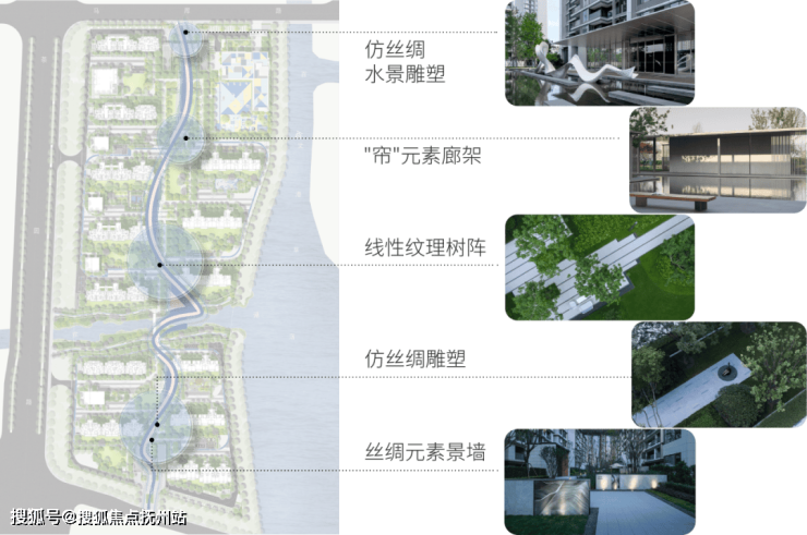 绕过丝绸雕塑和丝绸元素景墙,进入酒店式入户大厅,大厅高约5.1米、宽约24米,彰显大气与尊贵,穿过线性纹理的葱郁树阵,便是有理有序的叠水喷泉和约720平米的中央大草坪,再穿过“帘”元素廊架,草坪尽端的会客厅静候主人的归来,生活的美好向往至此落地生根。