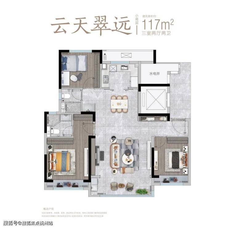 建面约106㎡户型,双卫生间,能满足两孩家庭、三代同堂的起居需求。约4.2m横厅,扩大了室内的采光面。