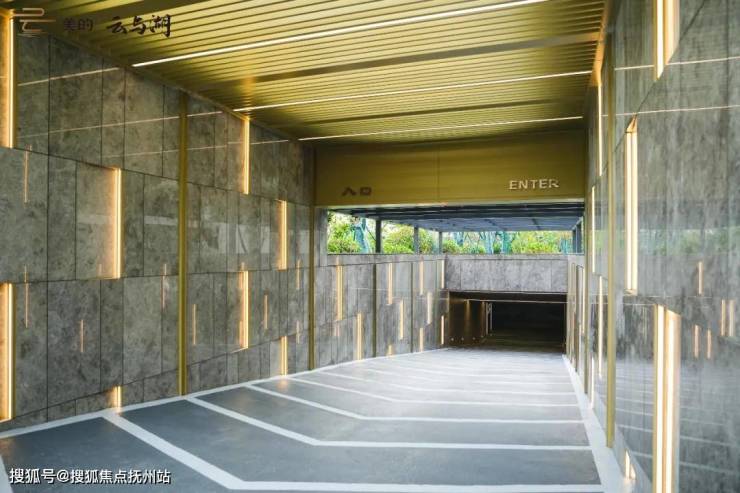 地库采用高品质的意大利灰石材用作入口景墙主要材料,金色金属嵌缝来增强建筑视觉效果,两侧墙面添加了“透光云石”壁灯。