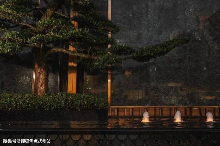 「笔墨门庭」处,宽约58米恢宏主入口,以酒店式落客空间迎宾,彰显归家的尊崇感。形似莲花的聚宝盆水景静卧其中,盆景罗汉松、黑松与蓝钻奢石景墙相映成趣,刚柔并济,寄托福泽绵长的美好寓意。