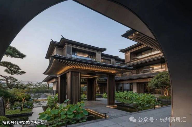 建筑立面:古今交融的诗意表达:外立面以香槟金铝板为基调,搭配蓝眼睛石材与玻璃幕墙,融合传统歇山重檐、纳福悬鱼等元素,既保留宋式建筑的对称美学,又赋予现代建筑的轻盈通透。合院组团采用三面庭院设计,L型景观面与环绕式檐廊,将超山梅影、丁山湖光引入每一扇窗景!