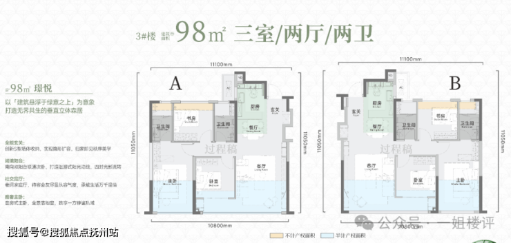 建面约98平三房两厅两卫:3号楼的连廊中间套户型。