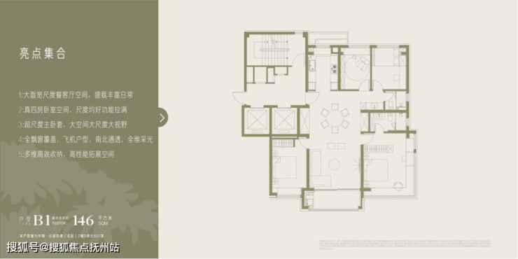 146㎡四房精准锚定多孩家庭、三代同堂的核心居住需求。户型采用三开间朝南的科学格局规划,最大化延伸南向采光面,搭配短进深大面宽的黄金空间比设计,让阳光与清风贯穿室内各个功能区,采光与通透感完全媲美更大面积段的户型产品。此外,干湿分离的卫生间设计,高峰期间可多人同时使用,互不打扰,进一步提升了日常起居的便利与舒适。两个北侧卧之间为非承重墙,既具备四房的功能性,也可灵活改造为大三房,满足家庭不同阶段的成长与变化需求,真正实现兼具实用性与自由度的理想居住体验。