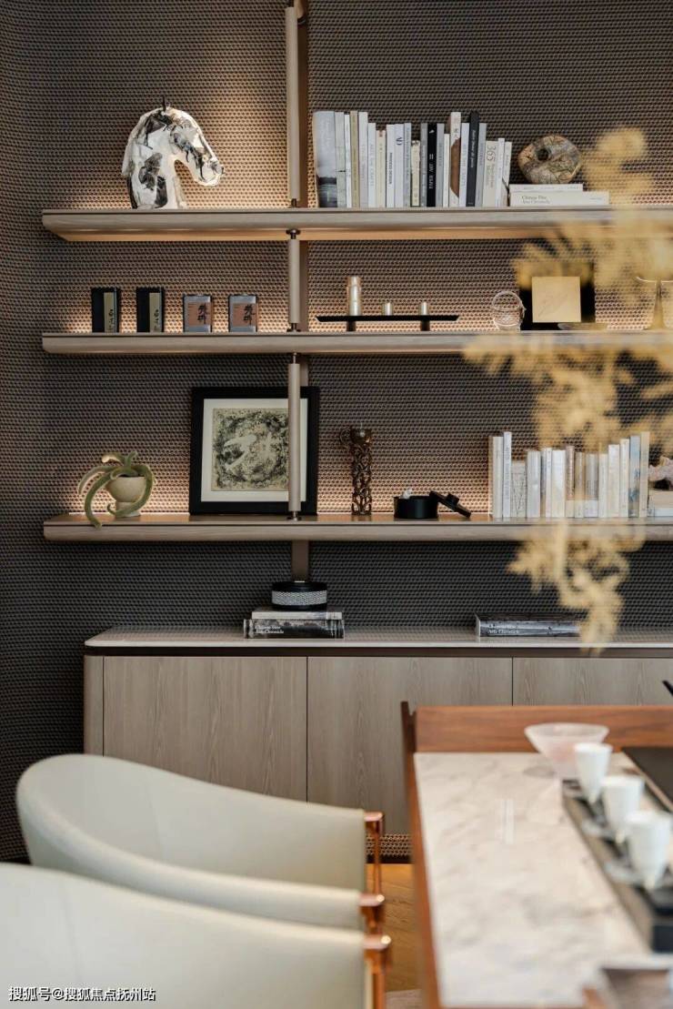 在茶室,设计师选用木美MaxMarko品牌,中式圈椅造型美学辅以天然皮革材质,温润的大理石结合古韵实木,古朴典雅又符合现代美学,在不同材质的碰撞中,探讨当代茶与生活方式的融合。一抹绿意伸展,袅袅烟影落于晴窗,私藏一隅东方雅韵,阅尽书籍的历史厚重感,在茶香与墨香中沉淀生命诗意。