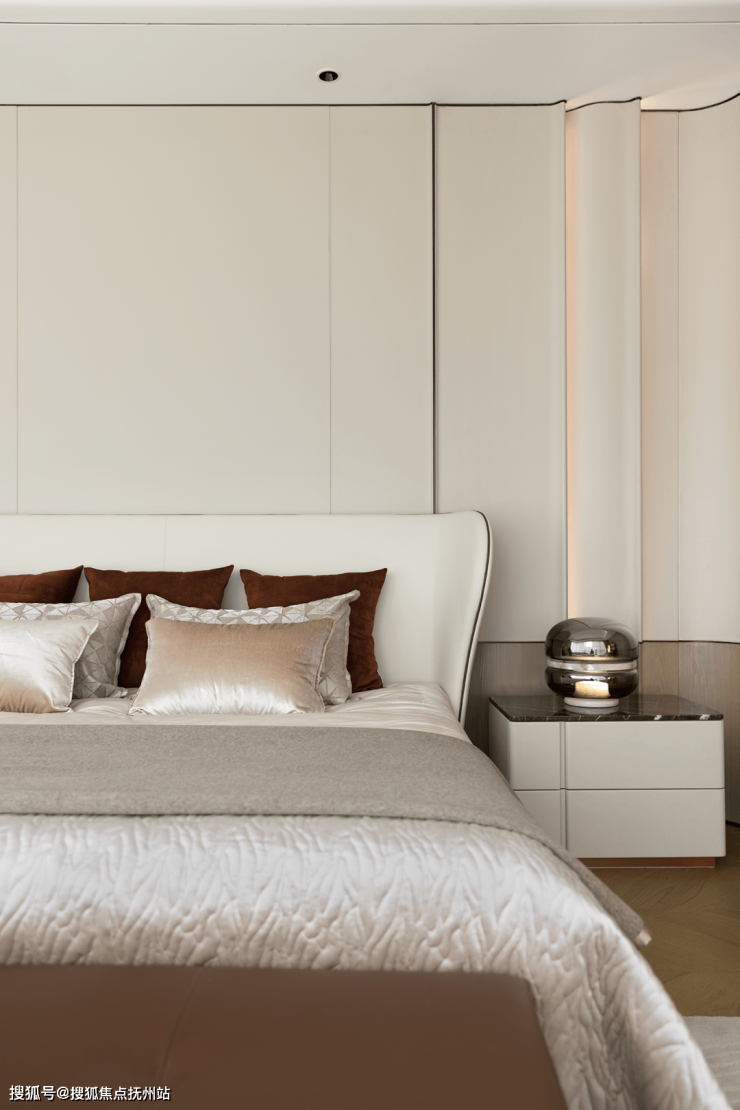 主卧延续了以米白和粽色为主的基调,打造出高级舒适的休憩之所。精炼的设计呈现出优雅整洁,简约而奢华的现代美感,在静谧之域中,安放生活的自在与柔软。