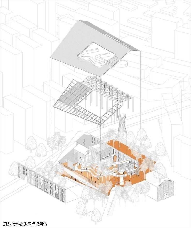 其西侧的水塔作为当地精神堡垒的象征,与飞廊相结合,刻画出基地最根本的水文化基因。