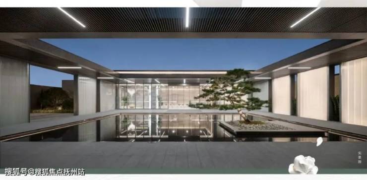 踱步而入,中央大面水景倒映天光云影,水中伫立一株苍劲迎客松,四季苍翠的古朴风姿迎风而展,驻足凝望仿若一卷中国写意水墨缓缓映入,满目风华。