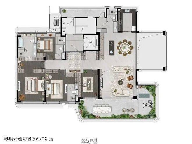 【别墅体验】:通过巨大的赠送露台和端厅设计,实现了别墅才有的庭院生活感和空间尺度,但居于城市核心的高点,视野更为壮阔。