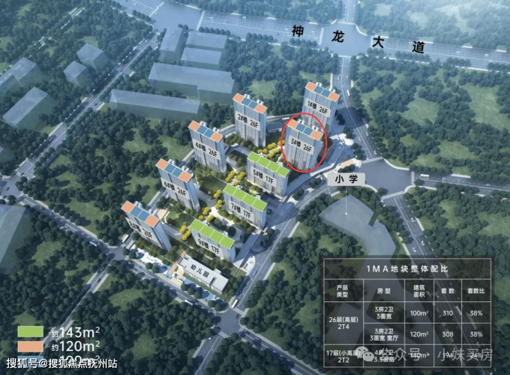 2、100平得房率约88%,143平得房率约95%,2025年12月底交付