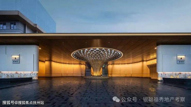 约250米长的超长景观墙界面,以及42m宽、4.8m高的仪式感门厅,入口采用酒店式环岛落客,中心设置寓意「天下四聚」的艺术装置,不仅展现出归家的蕴贵门面和仪式感,还与苏扇工艺打造的黄金池底基座互相辉映。