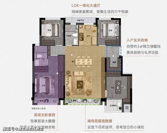 深谙人居偏好与发展趋势,建面约126㎡户型将卫浴、衣帽间、飘窗、休憩等多种功能融汇一体,规划打造尺度阔绰、考究私密、功能完善的约26㎡套房式主卧,为居者敬呈生活意境的礼赞。