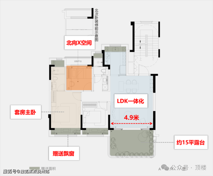 飘窗+北侧设备平台+约15㎡露台,带来超100%超高利用率,这是市面上传统产品完全不能比的!