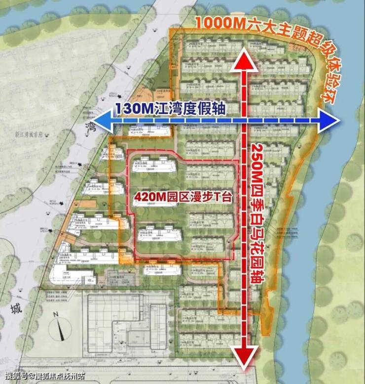 约130米的横向度假轴与约250米的纵向四季花园轴交织,串联起中央水景、阳光草坪、亲子游乐区等,与外部湿地公园呼应,形成“社区园林+外部生态”的双重景观体系,旨在实现四季有景、移步换景的梦幻居住体验。