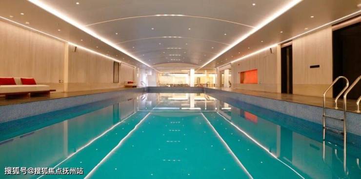 透过健身房,落地大玻璃还对着外面的四季恒温游泳池,让你享受一年四季优质的游泳体验,泳池区还添加了壁炉设计,火光与池水光影交织。