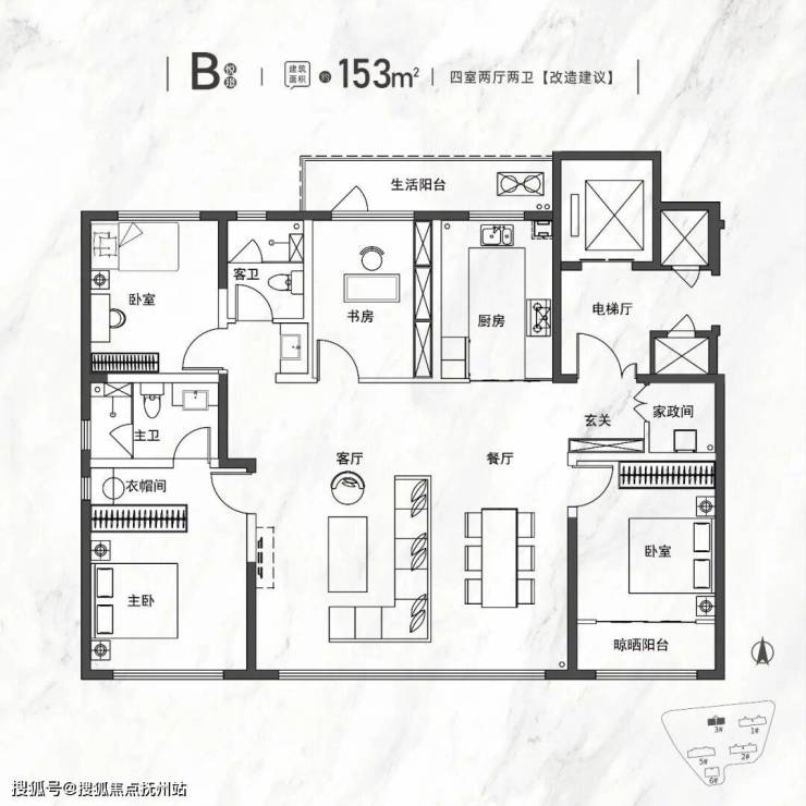 然而国信·和悦的153㎡户型,不但实现了一梯一户元宝户的改善标配,而且在保证四局的同时,客厅开间达到了7米。