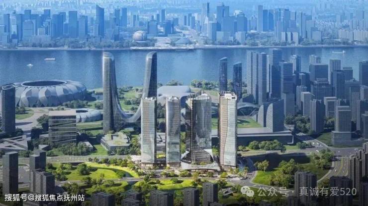 垂直布局:4栋140米超高层塔楼(含行政公馆、安达仕酒店、艺术中心等)沿奔竞大道展开,与“杭州之门”共同构成奥体“北斗七星”地标群