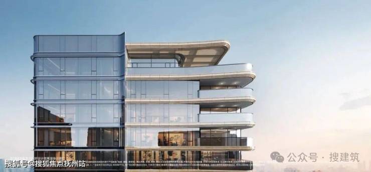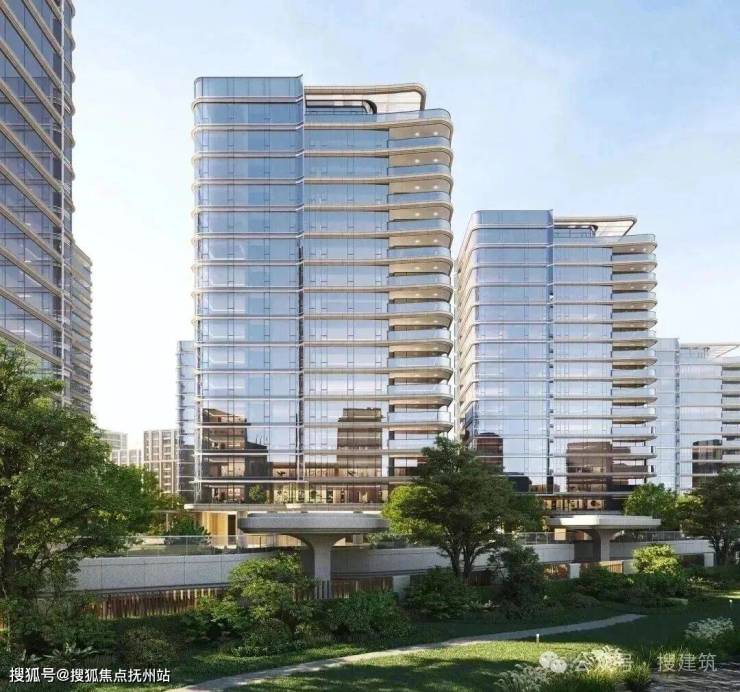 杭序府的外立面采用弧线转角阳台+蓝灰色钢化LOW-E玻璃,公建化立面拥有超高窗墙比。同时,大量曲线元素的运用,不仅造价昂贵,而且极具辨识度,成为区域的颜值担当。