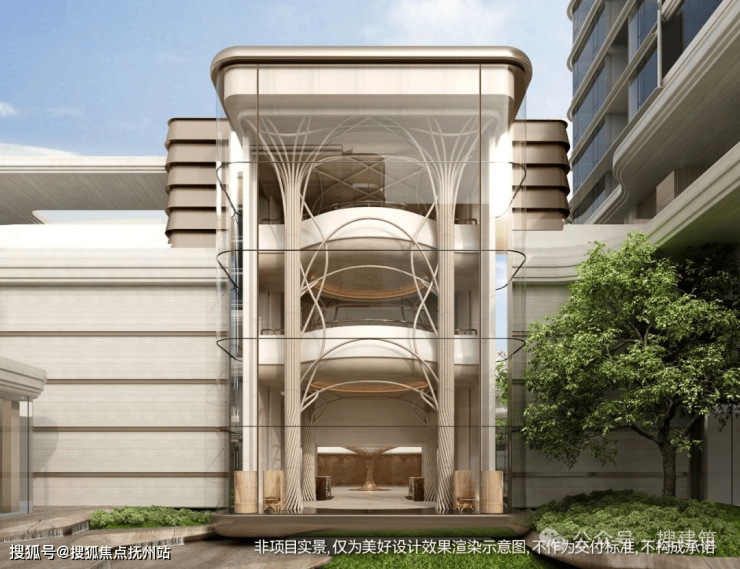 项目大门内外两重门厅景墙运用月光米黄石材近1000 方,搭配香槟金金属线条,汲取爱马仕全球旗舰店的双曲面叠墙造景手法,增加景墙奢华质感。