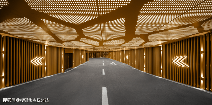 车道位置采用充满艺术造型的冲孔铝板,辅以射灯点缀和墙面双头射灯等设计,呈现秩序之美。