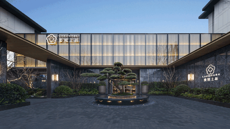 外立面设计:楼体外立面选用仿蓝眼睛真石漆与深灰色真石漆搭配,细部采用香槟金铝线条进行衔接,增加建筑的精致感。