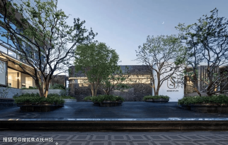 穿过小区大门后,眼前呈现一派绚烂水景,视野豁然开朗:五株婀娜香橼树在花坛中随风轻摆;叠层水幕沿着碧潭金沙、蓝眼睛花岗岩台阶潺潺流淌,营造出宁静祥和的归家心境。