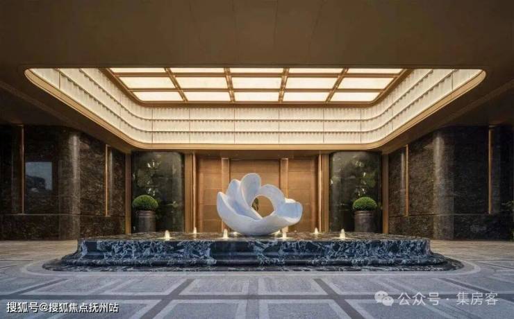 如山茶花般的定制石雕,映衬厚重的朱氏铜门,配上两侧大面荷塘月色奢石、铂金钻石材景墙,远远望去,宛如歌剧开幕时垂坠的天鹅绒帷幔,打开归家的仪式感。