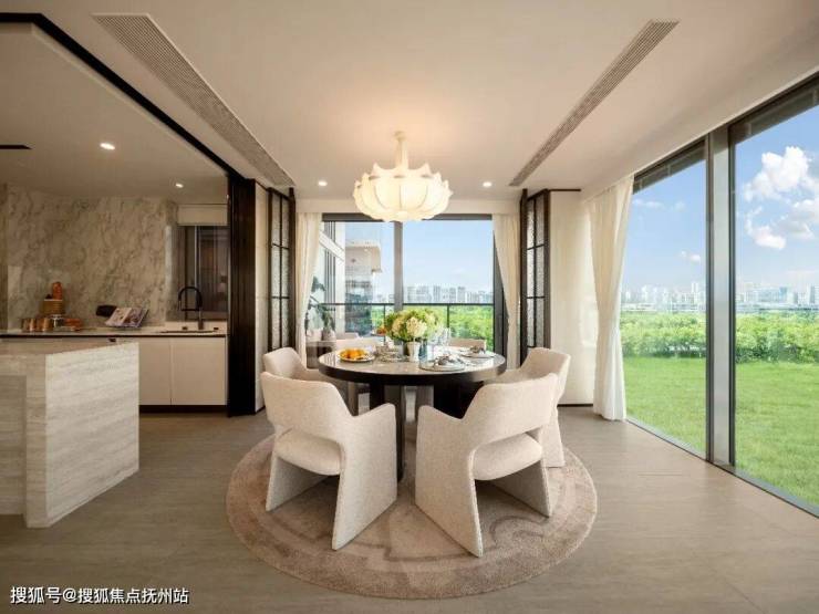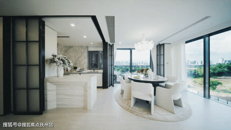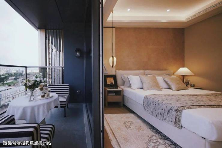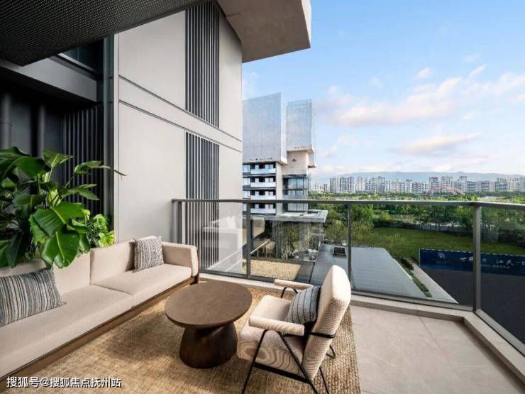 北向空中花园阳台更添意趣——大尺度挑高设计,角落置一组休闲椅。远处尽眺婺江的缓缓流淌,这里既是先生的雪茄角、太太的瑜伽台,也是全家人的“第二客厅”。