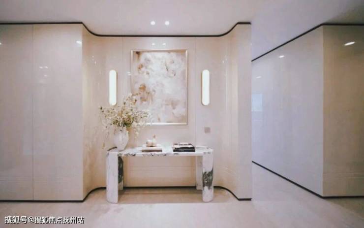 奢雅的石材地面光影流转,仿佛为归人铺好一条通往私域的幽径。迎面而至的一幅油画与花艺,让视线在秩序与艺术间自然过渡。