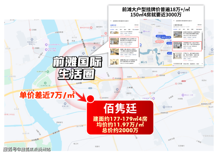 先看与前滩核心二手房的差距。前滩二手市场看似均价15-16 万/㎡,但这基本是小户型的水平;真正稀缺的大户型,成长性早已拉开差距,普遍站到18万+/㎡。像晶耀名邸 150+㎡4房,挂牌价超19万/㎡,总价直逼3000万;九宫格的三湘项目,挂牌价更是达19-25万/㎡的高位。