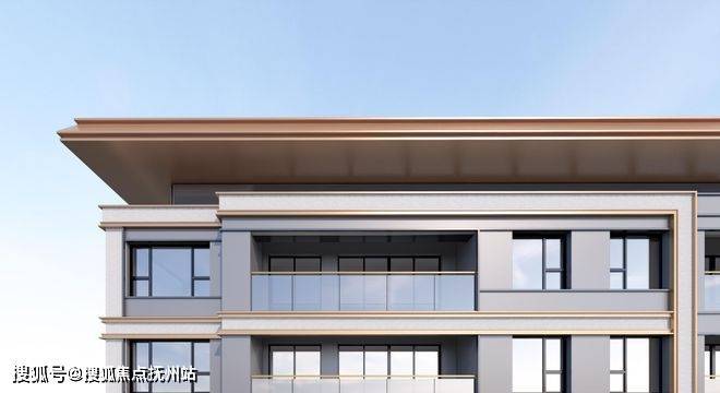 ◆现代立面:以大面积玻璃、香槟色装饰线条打造深灰色质感外立面,构建匠心美学范本。