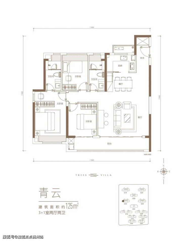 建面约125㎡的三加一室两厅两卫:该户型位于G4栋西边户,南北通透,三面采光,私密性、通透性和采光都不错;动静分区,活动区集中。