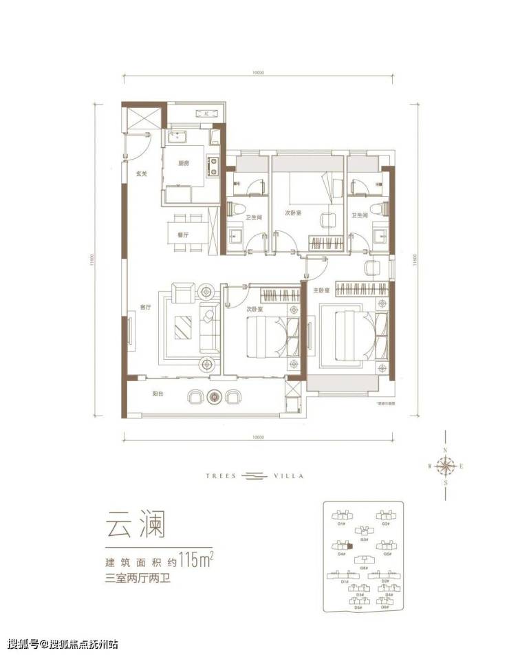建面约115㎡的三室两厅两卫:该户型位于G4栋东边户,户型结构与105㎡户型类似,但该户型位于边户,通透性和私密性更好,另外北向的公共卫生间带有飘窗,可优化面积更多。