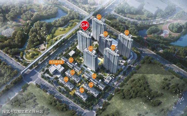 项目地块比较方正,所有住宅均为正南北朝向。预计首开的G4号楼高层位于地块西侧,紧邻豹溪路。
