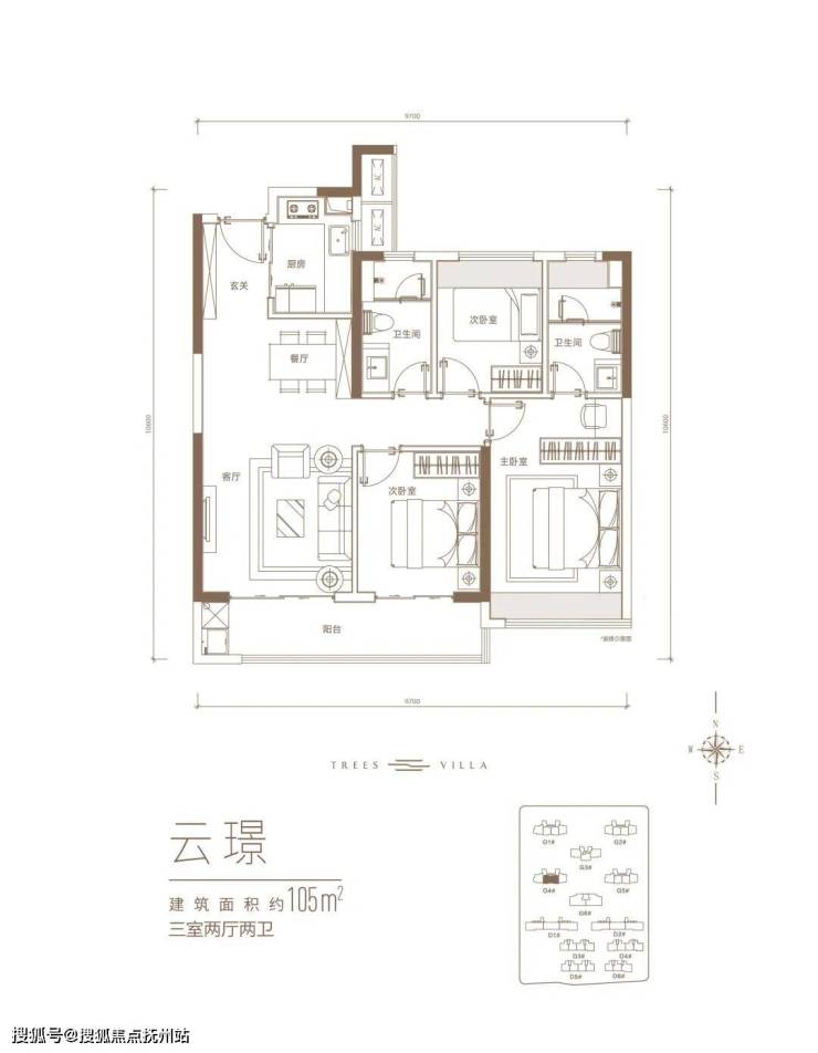 建面约105㎡的三室两厅两卫:该户型位于G4栋中间户,三开间朝南,采光好;动静分区,餐客一体,主卧套房设计,南北贯通,舒适度不错。