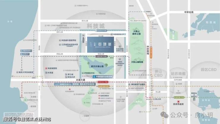 2、太湖大道无缝衔接北环全程高架直达姑苏、园区; 中环全程高架直达新区狮山、木渎、浒关、相城、园区北部,全城30分钟可达