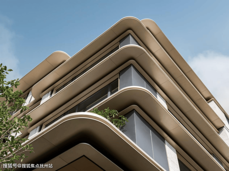 打破了传统立面单调、静止的设计范式,通过多层次的弧形曲面,营造出一种动态生长、与环境及光线共舞的灵动形态。同时,金属铝板、石材与玻璃等材质的精妙搭配,点、线、面的和谐统一,共同塑造出兼具视觉冲击力与触感温度的外立面美学。
