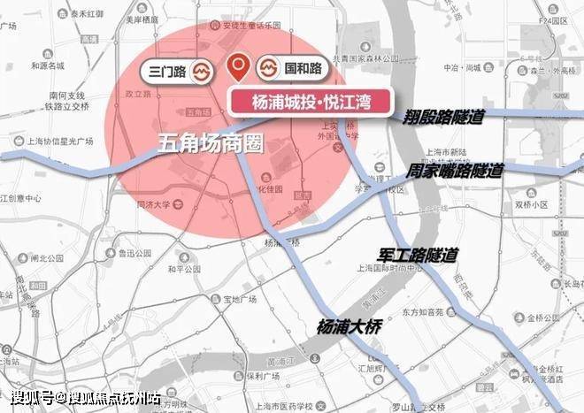 从项目地出发距离约1公里即可到达中环国和路上匝道口,直达市中心。翔殷路隧道,军工路隧道和周家嘴路隧道,是北上海连接浦东浦西的重要通路,也是五角场作为北上海“地区中心”,源源不断吸引来自宝山、嘉定、浦东北部区域人员财源的重要保障。