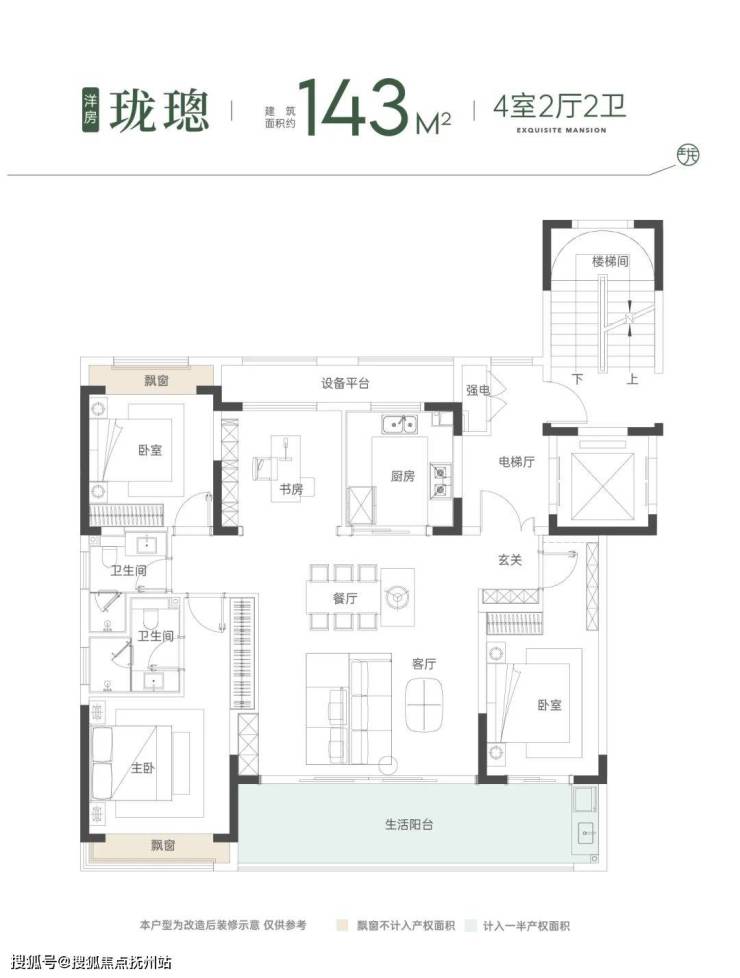洋房:建筑面积约143㎡ | 4室2厅2卫 ,一梯两户/南北通透/双开间阳台/豪华主卧套