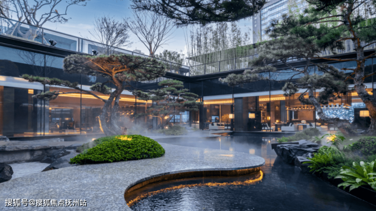 项目所在的地块堪称狮山极核——日趋紧张的当下,项目充分利用土地空间打造景观与公区。示范区园林,以“万壑松风”为灵感,提炼松林、飞瀑、石径、云雾、流泉五大场景,5棵泰山全冠移植的黑油松傲然挺立,约6米高的黑金沙花岗岩叠景墙流水潺潺,更有“翠玲珑竹节景墙”致敬沧浪亭,将苏州文化符号转化为可触摸的日常景观。整个社区景观面积充足,形成“内外双园”的格局,内部园林与外部运河景观相互呼应,为业主提供了静谧的休憩空间。