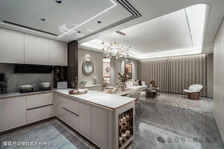 LDKB一体化设计,在餐厨区布局万能中岛台,打破了厨房与餐厅的界限,延伸烹饪空间,增加收纳空间,更将社交功能融入其中,重塑中国人的情感场域。