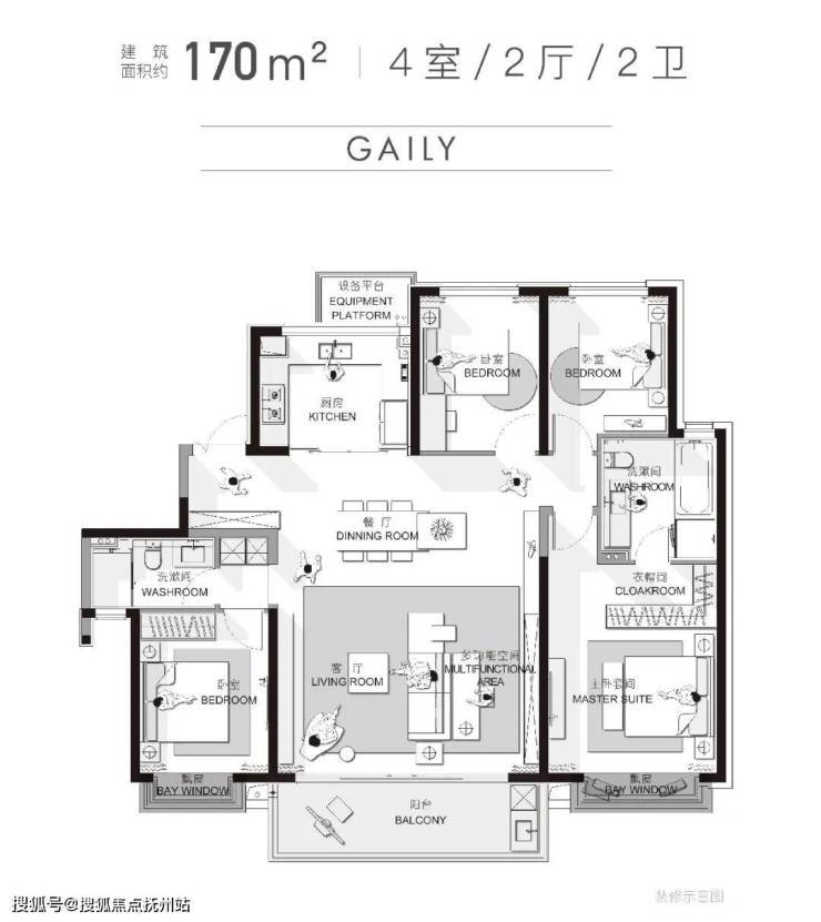 建面约170㎡四房两厅两卫:做到了宽屏大开间、全明采光、多套房配置,改善的排面和尊崇感尽显,非常适合追求该品质改善、或三代同堂的买房人。