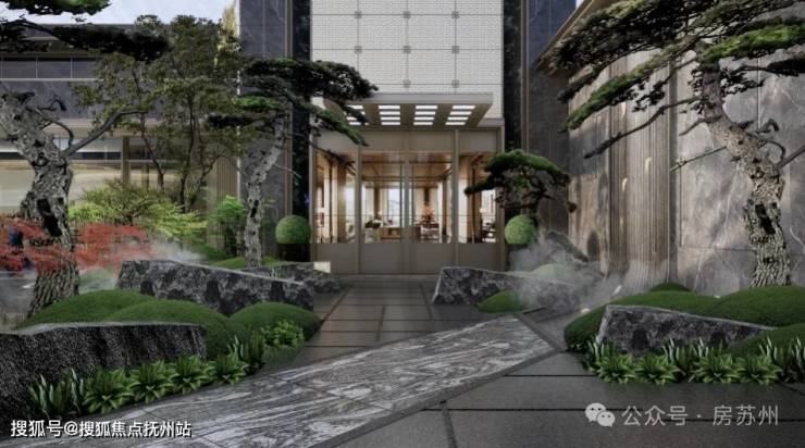 以外立面为例,三段式经典构图,融合苏式屏风,用大面积玻璃局部点缀奢石,顶部采用东方屋檐的建筑形制,尽显东方之美。