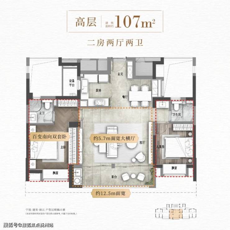 拿朗云刚加推的2#来说,约107㎡户型就是这幢的中间套户型。