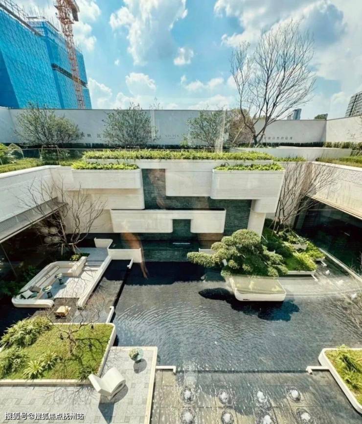 你看社区大门宽约46米,高约9米,灵感源自“京杭大运河博物馆”设计,顶部大约2280块水晶瓦精心雕琢,内部超300块金鳞铝板手工拼接,还有层叠水景,整个一看就贵气。